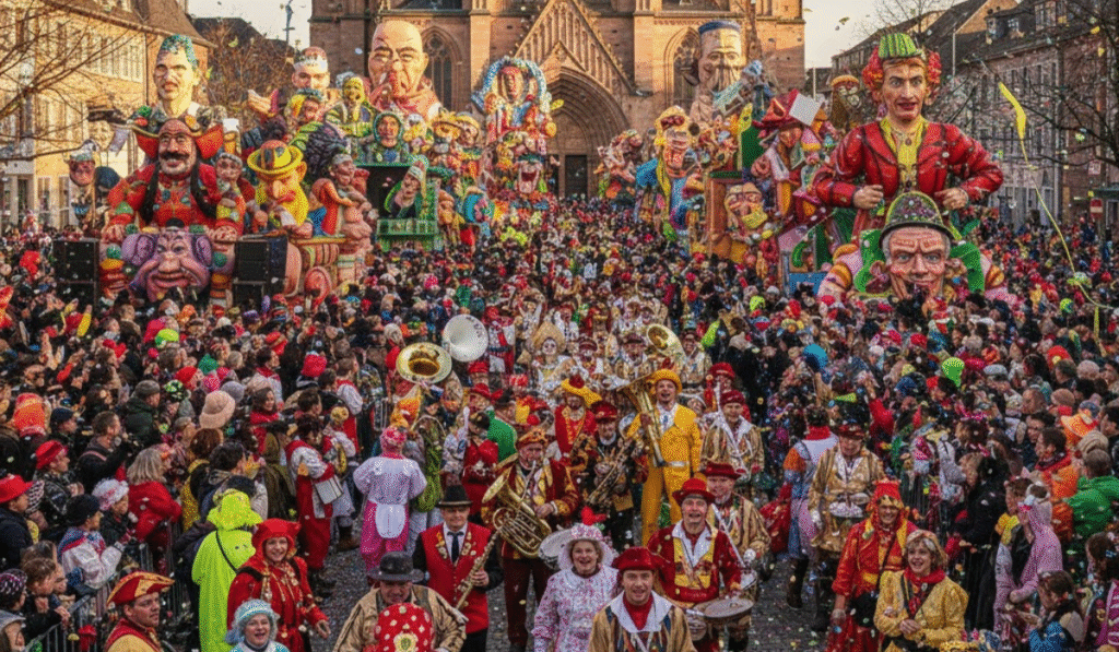 Der Rosenmontagsumzug ist der Höhepunkt. Festwagen ziehen durch die Stadt, jeder bunt und kreativ. Musikkapellen spielen, Kinder winken und der Klang der Feierlichkeiten hallt kilometerweit wider.